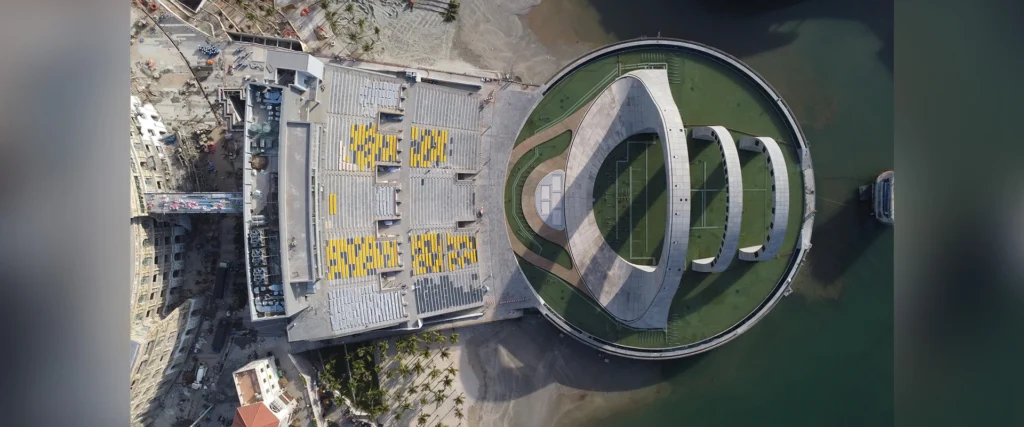 Quy mô dự án: Dự án có phần cọc và móng nằm dưới mực nước biển gồm: 1 tầng phòng bơm cao độ thấp hơn mực nước biển hơn 5m; 1 tầng hầm kỹ thuật vận hành thiết bị; 1 tầng bể nước và sân khấu biểu diễn trên 10.000m2